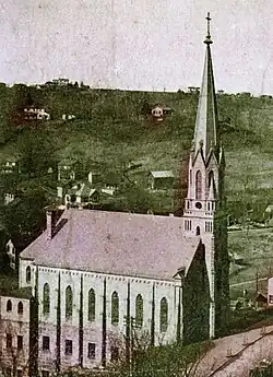 In 1849, Fr. Theophile Kraft arrived as the first resident pastor and oversaw the construction of the first wooden church on the site, built from trees cut nearby on Lincoln Hill and dragged to the parish site on Mulberry Avenue, just west of the current building.[3][1] This building served the parish for fifty years.[1][3]