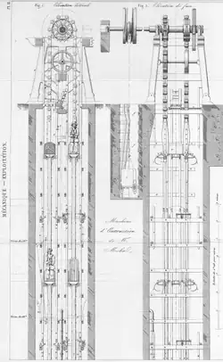 In May 1852, a second machine of the same type, but vertical, was put into service over the entire height of the shaft, replacing the Meyer coil machine. It too suffered numerous breakdowns, requiring frequent shutdowns to readjust various parts over several months and in the years that followed. Finally, on March 29, 1857, the Board of Directors decided to return to the cable extraction system, and the vertical cleat machine was dismantled in 48 days, starting the following May 17. A 9-meter-high wooden headframe was built over the shaft, and the Meyer machine was refurbished.[15]
