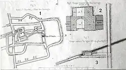 To accommodate the large workforce employed at the Saint-Charles shaft, a mining housing estate was built in 1872, a few dozen meters from the pithead. It consisted of four houses built of roughcast sandstone rubble, each with a single storey and long-sloped mechanical tile roofs.[23][24][25] Although the collieries had originally intended to build 24 dwellings, they had to give up for financial reasons. Each house is divided into four units, with two bedrooms, a kitchen, a cellar, an attic, and a garden for each family.[23] On March 11, 2010, the houses were listed in the general inventory of cultural heritage.[24]