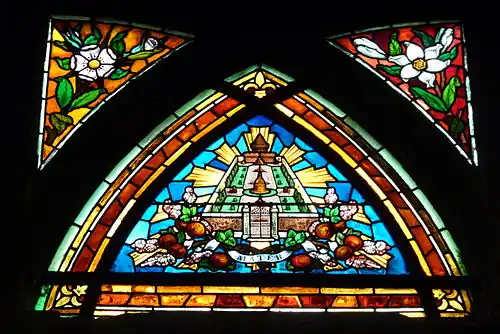 In addition to the larger and more elaborate windows, the sides of the nave are decorated with forty-eight colorful smaller triangular windows, illustrating the Litanies of the Virgin, and virtues associated with her.[19]