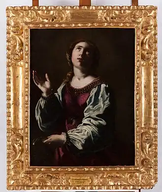 The painting depicts Saint Apollonia, a martyr who died in Alexandria during an uprising against Christians in A.D. 249.[1] The portrait shows the saint from the waist up, against a dark background, looking up, as if skyward. Her left hand extended upward, while her right hand is carrying a pair of tweezers with a tooth, an iconographic attribute that helps identify her as Apollonia.[2]