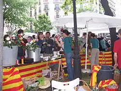 The sardana, the national dance of Catalonia, is performed throughout the day in the Plaça Sant Jaume in Barcelona. Many book stores and cafes host readings by authors (including 24-hour marathon readings of different classics of Catalan literature or Spanish literature). Street performers and musicians in public squares add to the day's atmosphere.[9]