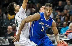 A Billikens men's basketball player dribbles the ball during the 2016 Atlantic 10 men's basketball tournament