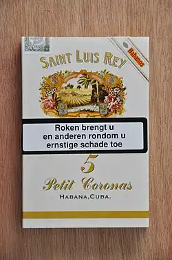 The brand's name is believed to be a reference to either the town of San Luis, Pinar del Río or the popular 1927 novel The Bridge of San Luis Rey by American author Thornton Wilder.[2] The brand was first registered by Zamora y Guerra Co., who were based in Havana.[3] In 1940, the name Saint Luis Rey was registered by two English tobacco importers, Nathan Silverstone and Michael De Keyser.[4][5]