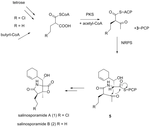 5. ^ a b Beer LL; Moore BS (2007). "Biosynthetic convergence of salinosporamides A and B in the marine actinomycete Salinispora tropica". Org. Lett. 9 (5): 845–8. doi:10.1021/ol063102o. PMID 17274624.