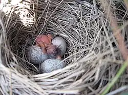 Saltmarsh sparrows are non-territorial and have large overlapping home ranges. Male home ranges are twice as large as those of females and may span 50 hectares (120 acres).[22] Saltmarsh sparrows are promiscuous, and the majority of broods exhibit mixed parentage.[23] During the nesting season, males roam long distances chasing and mounting females regardless of receptivity. Only females exhibit parental care, building the nest, incubating the eggs, and providing food to the young.[12] The nest is an open cup constructed of grass, usually attached to saltmeadow cordgrass (Sporobolus pumilus) or saltmarsh rush (Juncus gerardii) at a height of 6–15 centimetres (2.4–5.9 in). Clutch size is 3 to 5. Incubation begins after the last egg is laid and takes 11–12 days. Young fledge 8–11 days after hatching but remain dependent on the mother for an additional 15–20 days.[19]