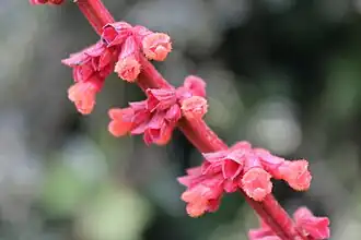 The dark green leaves, with a yellow undertone, are about 7 in (18 cm) long by 3.5 in (8.9 cm) wide, with serrated edges, and with velvety red-brown hairs on the petiole and stem of the new leaves. The leaves bear a sage scent. The inflorescences are covered with velvety red-brown hairs, with the stems and the calyx also having a red-brown color. The 0.5 in (1.3 cm) flowers are orange-red, and very profuse, explaining the epithet confertiflora, or "crowded with flowers". The plant grows so large that it needs staking and protection from wind in gardens.[2]