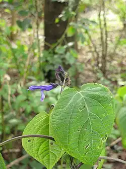 Salvia recurva is a woody-based perennial native to the cloud forests of Central America, limited to the northern slopes of Oaxaca, Chiapas, and Guatemala at elevations around 10,000 feet (3,000 m). It grows where there is year-round warmth and abundant moisture in the air and on the forest floor. Salvia recurva was described by George Bentham in 1848, with the specific epithet referring to the distinct curve in the inflorescence when it first appears.[1]