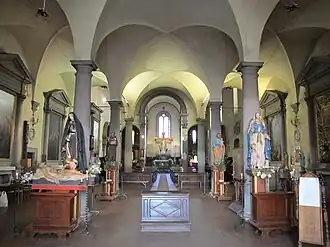 The interior had a Madonna with Child and Saints by Ridolfo Ghirlandaio. Another chapel has a fresco by Giovanni da San Giovanni, depicting San Felice reviving St Massimo; the angels gathering the grapes in the painting are by Baldassare Franceschini. It had a triptych (1467) by Neri di Bicci, depicting St Augustin and St John Baptist, and St Julian and King St Sigismond. Another chapel had a Madonna and Child with St Hyacinth, by Jacopo da Empoli.[1] The church has a Last Supper by Matteo Rosselli.