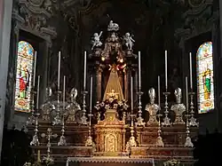 In 1993, the church experienced a theft of 37 paintings. Among the sculptures are the statues of the facade of Stefano Salterio and the angels ringing on the sides of the altar major work of Elia Vincenzo Buzzi active also in the Duomo of Milan. The church is also home to the statue of the newly discovered Virgin of Giovanni Angelo Del Maino: the sculpture was part of a filing commissioned by Del Maria by Maria Maria Rusca in 1518 and later lost.