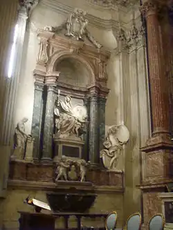 In 1634, the Baroque painter and architect Pietro da Cortona was asked by the Florentine nobleman Orazio Falconieri to design the high altar.[6] Drawings for the altar and its setting and a model were prepared but the project was not carried out. Cortona's ideas for the choir included windows hidden from the view of the congregation that would illuminate the altarpiece, an early example of the Baroque usage of a "hidden light" source, a concept which would be much employed by Bernini. Some twenty to thirty years later, Falconieri resurrected the choir project but gave the commission to the Baroque architect Francesco Borromini, who changed the design to allow for the burial of Orazio's brother, Cardinal Lelio Falconieri. After Borromini's death in 1667, the work was completed and partly modified by Cortona and, on his death in 1669, by Ciro Ferri, Cortona's pupil and associate.[7]
