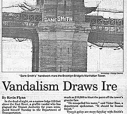 Sane Smith were among the most persistent Writers in New York during the 1980s. According to Smith, they set themselves and accomplished the goal of leaving a tag every 20 feet in the 60th Street Tunnel.[1][2] Sane & Smith are particularly notable for painting on the top level of New York's Brooklyn Bridge, after which they were sued by the City of New York for $3 million, the biggest lawsuit to date against graffiti writers.[3] The work covered both sides of the Manhattan tower of the bridge, and was visible for miles.[4]