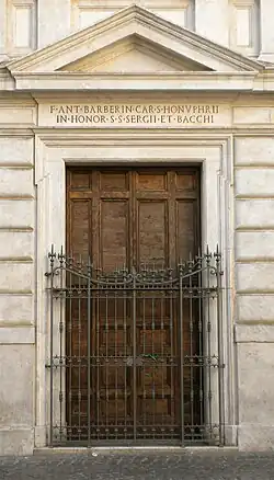 In 1587, when the church of Sts Sergius and Bacchus in the Roman Forum was suppressed as a cardinal deaconry, and the church demolished, it was succeeded by a renovated Sts Sergius and Bacchus in Monti. In 1622 it was entrusted by Pope Gregory XV (1621–23) to the Minim Friars of St. Francis of Paola who soon left it when they moved to another church near San Pietro in Vincoli.[4][6] The church was renovated under Pope Urban VIII (1623–44), through the patronage of his younger brother, Capuchin Cardinal Antonio Marcello Barberini (1569–1646, cardinal from 1624). [4] [6] Above the travertine doorway, the only part of the seventeenth century façade surviving today, is an inscription that records this work: