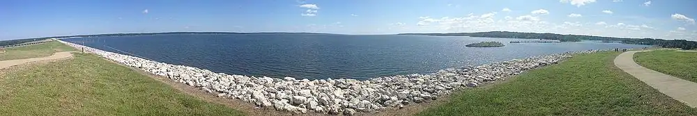 The main fish that live in the lake are largemouth bass, spotted bass, blue catfish, channel catfish, flathead catfish, black crappie, white crappie, bluegill, redear sunfish, and white bass.[5]