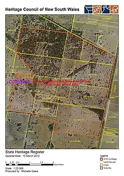 The property was part of the land of the Pangerang Aboriginal people and there is evidence of approximately six canoe / scar trees adjacent to the ephemeral creekline, and extensive areas of middens and oven mounds. "Situated along an ephemeral creek line, mounds occur up to 100 metres (330 ft) from the watercourse. They are approximately 6m in diameter, and 10–30 centimetres (3.9–11.8 in) high, spaced about 10 metres (33 ft) apart or superimposed on older specimens. Some have rare stone artefacts either on the surface or embedded in the mounds. Cultural material is likely buried within the mounds. This semi-continuous mound formation appears to be huge. This would mean thousands of earth ovens are present in this area."[7] Considered significant.[1]