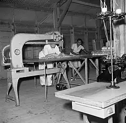 In 1948, Pierre Schunck (1906-1993), stemming from a family of weavers and son of the builder of the famous Glaspaleis in Heerlen, the Netherlands (see Schunck), arrived in Bonaire to set up a clothing industry (Kledingindustrie).[1] This clothing manufacturing would become Bonaire's first real industry, providing employment—and health care—for a large part of the young women who were left behind when many men had left as sailors or to work for the oil companies on Curaçao and Aruba. Preparations for the operation of this company would also result in better electricity and water supplies; eventually it would account for half the exports of the island.
