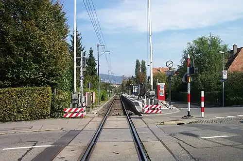 The station has a single track, and a single side platform. The only building is a simple shelter on the platform. Immediately to the west of the station, the line crosses Schweighofstrasse by means of a level crossing.[5]