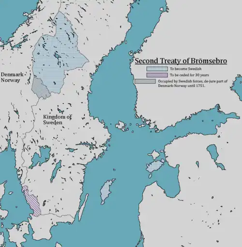 The Second Treaty of Brömsebro (or the Peace of Brömsebro) was signed on 13 August 1645, and ended the Torstenson War, a local conflict that began in 1643 (and was part of the larger Thirty Years' War) between Sweden and Denmark–Norway. Negotiations for the treaty began in February the same year.