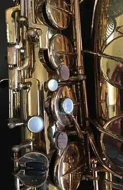 The design of the Mark VI evolved over time. Switching over from its predecessor, officially named the Super Action but commonly called the Super Balanced Action, Selmer's earliest Mark VI models were transitional, incorporating design elements from the preceding model. Tonally, early examples are considered to have a "dark" tone, while later examples are thought of as having a "bright" sound. The bore taper, bow, neck designs, and some mechanical features changed throughout the history of the Mark VI.[1] The changes were not documented by Selmer. The length of the bow was increased on altos during the 85K serial number range to address certain intonation issues. In subsequent years the short bow was reintroduced. Some altos had baffles soldered into the bow to correct intonation issues. At least three changes to neck design were made on the tenor during the 1950s and 1960s, and once again in the 1970s. Some contend that the neck design changes account for the different tonal and playing qualities between earlier and later Mark VIs. Others contend that Mark VIs produced after about SN 180,000 had harder metal as a result of a change in the metalworking process, however, that SN corresponds to a known change in neck design so differing characteristics before and after can not definitely be ascribed to metallurgy.