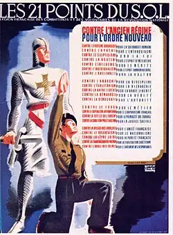 This new organization was headed by Darnand, Pierre Gallet, Marcel Gombert and Jean Bassompierre, whereas its program was defined by Bassompierre, Noël de Tissot and the docteur Durandy. It advocated the cult of the leader, anti-parliamentarism, racism and anti-Semitism, as well as pushing for collaboration with the Nazis. Before the 1941-1942 turn of public opinion, France was mostly composed of pétainistes, who supported Marshal Pétain. However, various grades of collaborationism must be distinguished, as some advocated it claiming it would lighten the burden of the military occupation (this was Pétain's official discourse) and that Marshal Pétain, a figure highly respected for his role during the 1916 Battle of Verdun, couldn't be wrong. These collaborationist have been called Maréchalistes, as their support of the collaboration was rather based on trust towards Pétain. After his meeting with Hitler, Pétain had advocated collaboration in an 30 October 1940 speech to the radio. Others, commonly called pétainistes, advocated collaboration on ideological grounds: they supported Vichy's anti-Semitic laws which the regime had put in place on its own, without waiting for German orders. Joseph Darnand and the SOL, were at the spearhead of these ideological collaborationists, eagerly hoping for German victory in the war