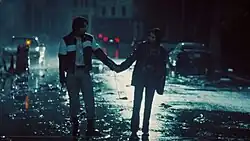 The video opens with Jungkook and Han arguing at a restaurant on Monday, during which an earthquake causes a chandelier to crash down from the ceiling onto a table and the walls to explode.[68] On Tuesday, he serenades her while hanging off the window of a train she is on then walks atop the train, following her as she switches cars.[69] On Wednesday, Jungkook tries to capture Han's attention at a flooding laundromat, to which she responds angrily. On Thursday, he is hit by a car while attempting to give her flowers. On Friday, Jungkook follows her during a rainstorm, which culminates with him being blown away by the wind. Latto appears during Jungkook's funeral on Saturday and performs her verse atop his coffin at one point before he suddenly resurrects and greets Han. On Sunday, Jungkook sings to her while on a suspended platform. At the end of the video, which returns to the rainstorm on Friday, Han eventually reaches for Jungkook's hand and the two walk away together in the rain.[69][70][71]