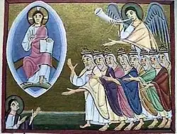 In the Book of Revelation, seven trumpets are sounded, one at a time, to cue apocalyptic events seen by John of Patmos (Revelation 1:9) in his vision (Revelation 1:1). The seven trumpets are sounded by seven angels and the events that follow are described in detail in Revelation 8–11. However, there are also many other messages, events and signs that occur before and after the trumpets that are described in the Book of Revelation, as this is only one section. According to Revelation 8:1–2 the angels sound these trumpets after the breaking of the seventh seal. These seals secured the apocalyptic document held in the right hand of Him who sits on the throne.[1] The trumpets are referred to in Koine Greek as σάλπιγξ (sálpinx, salpinx); this was a straight, narrow bronze tube with a mouthpiece of bone and a bell; they do not closely resemble modern valve trumpets. The final three trumpets are sometimes called the "woe trumpets".[2]
