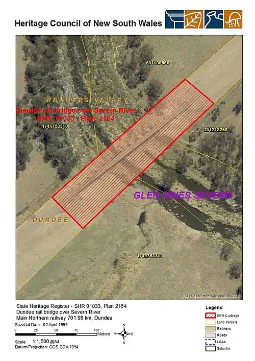 This Wikipedia article was originally based on Dundee rail bridge over Severn River, entry number 01033 in the New South Wales State Heritage Register published by the State of New South Wales (Department of Planning and Environment) 2018 under CC-BY 4.0 licence, accessed on 2 June 2018.