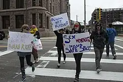 The passing of Bill C-36 in 2014 (the Protection of Communities and Exploited Persons Act) criminalized the purchasing of sexual services in Canada.[51] It stigmatized sex work by condemning sex work clientele and positing sex workers as victims of sexual exploitation.[51] The criminalization of purchasing sexual services created riskier working conditions for sex workers due to services going underground to avoid clients being policed.[52][53] For instance, sex workers now rush negotiations with clients to avoid being caught by the police.[52] This bill has been referred to as 'end-demand legislation' and has been critiqued by sex workers and advocates in that it furthers harm experienced by sex workers rather than eliminating it.[53] Their response to this legislation has been to call for the decriminalization of sex work and the purchasing of sex work services.[53][52]