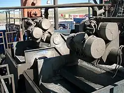 - Screen basket - Also known as the screen "bed" it is the most important part of the machine, it is responsible for transferring the shaking intensity of the machine, measured in "G's", while keeping the "shaking" motion even throughout the entire basket. It must do all that while holding the screens securely in place, eliminating drilled solids bypass to the hopper and allowing for easy operation and maintenance of the machine. Different brands of shakers have different methods of fulfilling these demands by using specialized screen tensioning apparatus, rubber seals around the screens, basket reinforcement to limit flex, rubber float mounts rather than springs, rubber deck seals and selective vibrator placement.