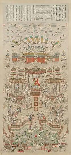 Shandao was one of the first Pure Land authors to argue that all ordinary people, and even the most evil person, can be reborn in the Pure Land by relying on the karmic power of Amitābha Buddha's past vows.[1] Shandao was also one of the earliest Pure Land authors to teach the primacy of faithfully reciting Amitābha's name (nianfo). Shandao saw this practice as sufficient for birth in the Pure Land, and as the supreme practice (even more important than meditation).[3][4] This, along with Shandao's efforts to teach common laypeople in various ways, like disseminating paintings of the Pure Land, made Pure Land Buddhism much more accessible and popular among the common people.[5]