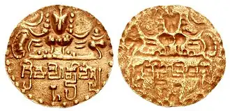 All the inscriptions written in the so-called "box-headed" script. The tops of the characters appear to be small square-shaped boxes, resulting in this nomenclature.[30] These characters are similar to the ones occurring in the Vakataka records. However, the Vakataka characters are less stylised, and therefore, can be assigned to an earlier period. It is not certain if the Sharabhapuriya characters are a result of the Vakataka influence.[31]