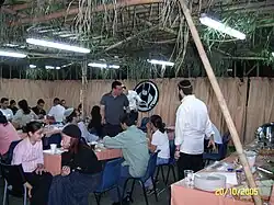 There are, however, those who have different minhagim (customs). Many Hasidic groups have a tradition to recite the morning kiddush and then have refreshments (such as cake) in the sukkah, but to eat both the evening and morning main meals inside, notwithstanding the Talmudic ruling to the contrary. Others eat the evening meal of Shemini Atzeret indoors but the day meal in the sukkah. Each of these approaches addresses aspects of the dual nature of Shemini Atzeret.[40]