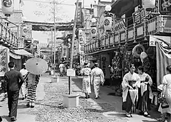 The site of modern day Shikyōgoku Street corresponds to the Higashi Kyōgoku Ōji street of the Heian Kyō.[1] Between 1573 and 1592 many Buddhist temples were built in the area, which also stimulated the development of entertainment businesses on the surroundings. Then, in 1872, Shinkyōgoku Street was built as part of a plan to boost the morale of the residents, which was in decline after the relocation of the capital to Tōkyō. By 1877, a great number of entertainment businesses, bars and restaurants had flourished and eventually by the end of the 19th century the place became one of the 3 major entertainment districts of Japan.[3]
