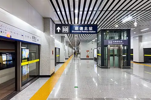 Shunde North railway station (Chinese: 顺德北站; pinyin: Shùndé Běi Zhàn; Jyutping: Seon6dak1 Bak1 Zaam6) is a railway station in Shunde District, Foshan, Guangdong, China. The station opened on 26 May 2024, and is operated by Guangdong Intercity Railway Operation Co., Ltd.[2][3]