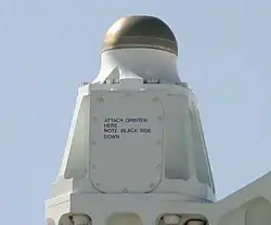 The rear mounting points on both aircraft were labeled with humorous instructions to "attach orbiter here" or "place orbiter here", clarified by the precautionary note "black side down".[12][13]
