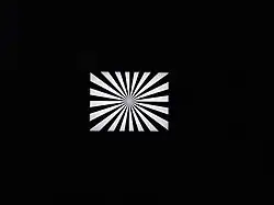Under optical blur from defocus, a Siemens star (like any periodic pattern) gives rise to the phenomenon of spurious resolution[1][2] above the resolution limit, i.e. toward the center of the Siemens star. (Spurious resolution appears similar to aliasing, but it is a purely optical phenomenon, so it occurs without need of pixels.) This results in inverted polarity of the stripe pattern: black stripes appear in the place of white stripes and vice versa (and further polarity inversions occur further inward). (The illustration under Optical transfer function shows spurious resolution caused by blurring.) When looking at the Siemens star with slightly blurred vision, e.g., without spectacles or with defocus from staring, this is seen as a shimmering ring around the Siemens star's center that changes size with viewing distance.