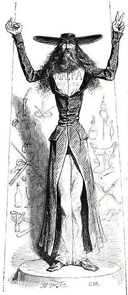 Ganneau, drawn in 1883 (after his death) by contemporary cartoonist Charles-Joseph Traviès de Villers, in front of a poster depicting the five phases of the world he preached would occur.
