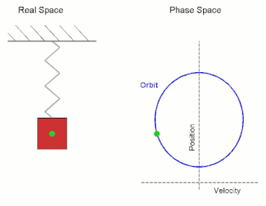 Simple harmonic motion shown both in real space and phase space. The orbit is periodic. (Here the velocity and position axes have been reversed from the standard convention to align the two diagrams)