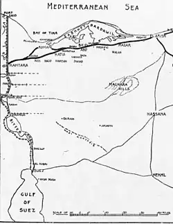 Murray planned a 50,000-strong garrison in the Katia area and obtained authority to build a pipeline to pump fresh Nile water and a railway to transport the infantry divisions and their supplies.[40] He also decided to empty the water cisterns at Moya Harab so the central Sinai route could not again be used by Ottoman columns advancing from Palestine and to maintain some troops at Suez to defend the town.[41] These operations began in February 1916 when construction started on the 25 miles (40 km) stretch of 4-foot 8 inch standard gauge Sinai railway and water pipeline from Qantara/Kantara to Qatiya/Katia.[39][40] By the end of March or early in April 16 miles (26 km) of track, including sidings, had been laid.[42]