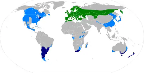 The species has reached other continents, such as Australia, South Africa and North America, through the export of timber and firewood. While invasion was prevented in North America for a long time, the European woodwasp established itself in New Zealand around 1900. There, it contributed to massive pine declines in the first half of the 20th century, spreading to Tasmania in the 1950s and then to the Australian mainland. Since 1980, it has reached pine plantations in Uruguay, and later also Argentina, Brazil and Chile; it was found in South Africa in 1994. The population increased in the Great Lakes area from 2004 on; the species had reached Vermont, New York, Pennsylvania, Ohio, and Michigan by 2009.[12][13] The woodwasps can swarm between 20–50 km (12–31 mi); it has been estimated it will take until about 2050 to spread to the far southeast of the USA at the current rate of spread.[14][15]