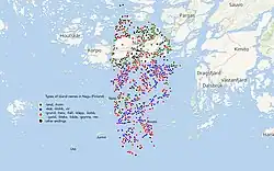 The points on the map represent island name suffixes between Kumlinge (East Åland) and Hangö (West Nyland) including most of the Archipelago Sea such as Nagu.