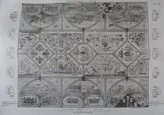 The Skelmorlie Aisle contains a notable monument built by a local landowner, Sir Robert Montgomerie of Skelmorlie Castle, seventh Laird of Skelmorlie, as a burial site for himself and his wife, Dame Margaret Douglas.[1] The aisle was added to the old kirk (church) of Largs in 1636, and comprises a Renaissance canopied tomb above the burial-vault entrance. The barrel vaulted ceiling of the aisle was painted 1638 in panels, with heraldic emblems and signs of the Zodiac, etc. by a Mr. Stalker.[2] A third coffin within the tomb is said to be that of Sir Hugh Montgomerie of Eaglesham, a hero of the Battle of Otterburn.[1] It can be compared with other significant tombs, such as that of the Cunninghames, Earls of Glencairn at Kilmaurs in East Ayrshire.