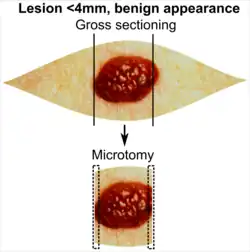 - With a "standard histologic examination" that, in addition to the lesion, only includes one section from each side along the longest diameter of the specimen.