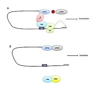 - ^ Zaessinger, Sophie; Busseau, Isabelle; Simonelig, Martine (November 2006). "Oskar allows nanos mRNA translation in Drosophila embryos by preventing its deadenylation by Smaug/CCR4". Development. 133 (22): 4573–4583. doi:10.1242/dev.02649. ISSN 0950-1991. PMID 17050620.