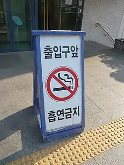 Smoking in South Korea (Korean: 스모킹 인 사우스 코리아) has decreased overall for both men and women in the past decades. However, a high prevalence of tobacco use is still observed, especially with the rise of novel tobacco products such as e-cigarettes and heat-not-burn tobacco products. There are socioeconomic inequalities in smoking prevalence according to gender, income, education, and occupational class.[1] Advocates call for measures to reduce the smoking rates and address smoking inequalities using a combination of monitoring and tobacco control policies. These measures include significant price hikes, mandatory warning photos on cigarette packs, advertising bans, financial incentives, medical help for quitting, and complete smoking bans in public places.[2]