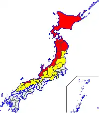 Map showing Japan's “snow country”. Red indicates prefectures completely inside it; yellow, prefectures partially in it.