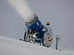 Snowmaking is the production of snow by forcing water and pressurized air through a "snow gun", also known as a "snow cannon". Snowmaking is mainly used at ski resorts to supplement natural snow. This allows ski resorts to improve the reliability of their snow cover and to extend their ski seasons from late autumn to early spring. Indoor ski slopes use snowmaking. They can generally do so year-round as they have climate-controlled environments.