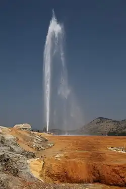 The city is named for the hundreds of natural springs of carbonated water that are located in and around the city.[6] The springs were known to Native Americans, and were a landmark along the Oregon Trail in the middle 19th century. The city is also the location of the Soda Springs Geyser, which was unleashed in 1937 when town fathers were seeking hot water for a hot pool bathing attraction. They drilled into a chamber of highly pressurized carbon dioxide gas and cold water, and the geyser erupted. After running for weeks and flooding the downtown area it was capped and then manually released, at first upon request, as a tourist attraction. More recently a timed release valve opens every hour on the hour. The geyser's height and volume have not decreased in the decades since. Viewing platforms are located at either end of the travertine mound where the geyser erupts. Interpretive signs are located on the platforms explaining the phenomenon.[7]