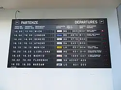 The company's Cifra 5 clock was awarded the Compasso d'Oro in 1956.[2] In this year, Solari sold its first moving sign to Liege railway station in Belgium. It subsequently sold thousands to airports and train stations. There is no known record of surviving Solari split-flap displays, though hundreds have been replaced with more modern displays across the world.[1]