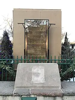 The monument consists of a stone obelisk with four engraved marble panels on the stone base commemorating U.S. soldiers who died in battles in New Mexico. It is located in the central area of the Santa Fe Plaza in downtown Santa Fe.[11] The monument has a stone foundation; a locally produced brick and lime core plinth; local stone inscribed panels; imported Italian marble trim with marble columns and marble wreathes (Victorian funerary motifs), and marble obelisk. The cenotaph, with its Egyptian architectural associations, is 33-feet tall.[9][12] Builders were McGee & Brother (John and Michael McGee), architects, master stone cutter Tomas Baca, and local craftsmen.[13] The stone panels were inscribed by local craftsmen.[14]